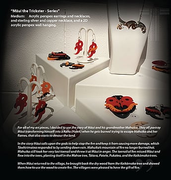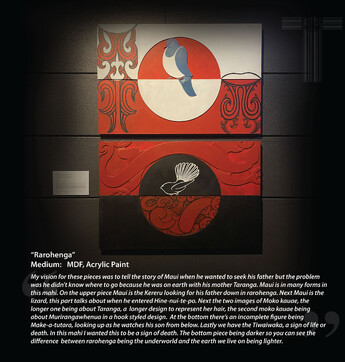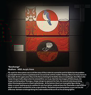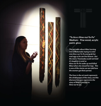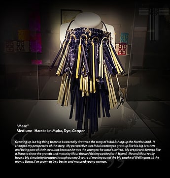 While the purpose of the project explored collaboration and mentoring, the interconnecting themes within each of the artworks navigated the legacy of Māui Pōtiki, Māui Tikitiki a Taranga, however not only narratives of Māui, but also, and for some of the artists more importantly, the various connections and whakapapa that gave breath to this legacy. The artists were given challenge to not only explore these threads, but also give voice to how these various kōrero resonated within their own personal journey and how these connections have transformed their work, interweaving metaphors to reference and challenge issues and innovations of today, especially during these times amongst and beyond COVID-19.